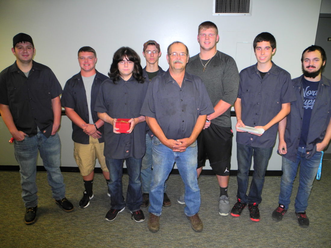 - ALSO RECIEVING — Brooke High School’s machine tool technology classes received a grant from the state Department of Education to purchase two new jet lathes. In front are student Hunter Morris and Bill West, course instructor; and behind them, from left, students Landen Urban, Dawson Kemp, Ryan Lancaster, Jonathan Gallagher, Dylan Holloway and Corey Lancaster. — Warren Scott