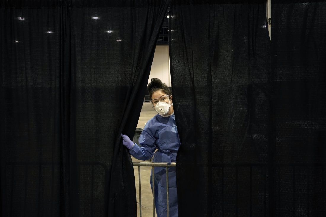 Diana Vega, a registered respiratory therapist, peeks through a curtain during setup at a temporary coronavirus testing site Monday, Aug. 3, 2020, in Las Vegas. (AP Photo/John Locher)