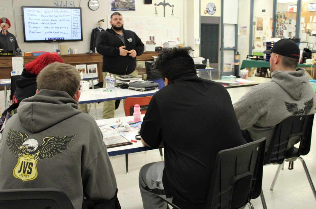Austin Simmons, a 2014 graduate of the Jefferson County Joint Vocational School and a corrections officer at the Belmont Correctional Center in St. Clairsville, visitand spoke to students in the criminal justice program about career opportunities. Simmons said employees held an array of jobs from officers to administrative staff and received good pay and benefits, plus there were chances for advancement. An added plus was that union members can receive a free education.