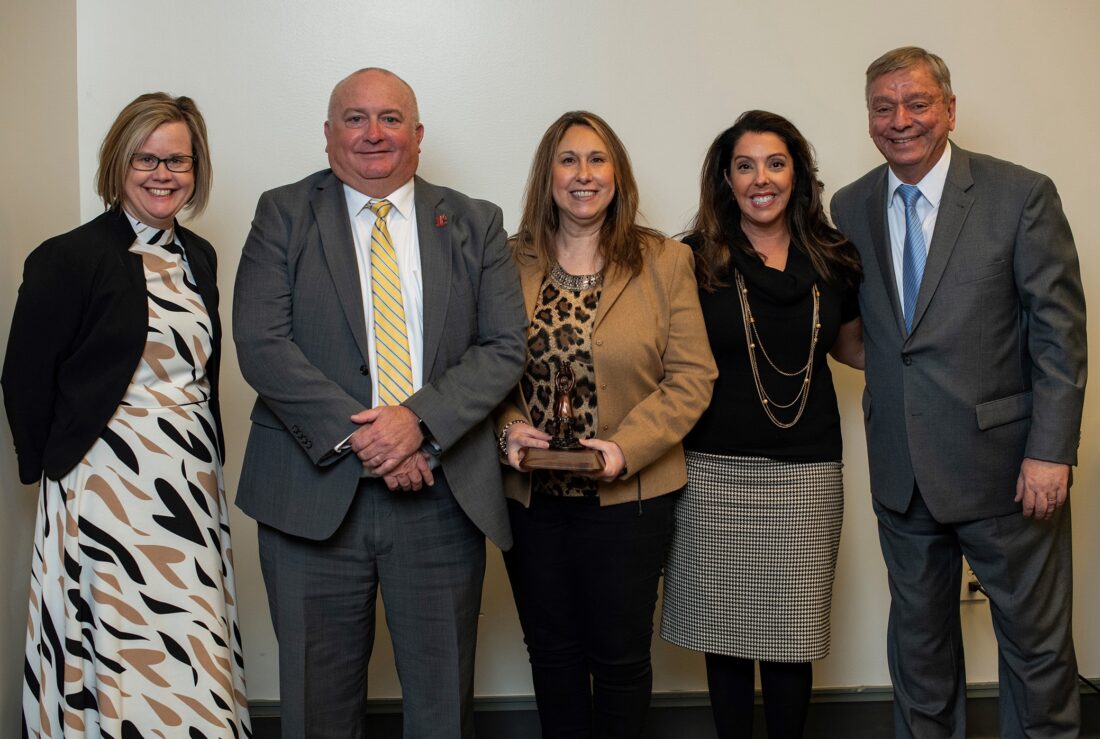 HONORED — Indian Creek Middle School math teacher Cathy DiBenedetto, center, received the Coalition of Ohio Rural and Appalachian Schools’ Outstanding Middle School Teacher Award for the Indian Creek Local School District at Ohio University in Zanesville. She was joined by, from left, Ohio Department of Education Chief of Staff Jessica Voltonlini, Indian Creek School Superintendent T.C. Chappelear, ICMS Principal Holly Minch-Hick and former state Rep. John Patterson. -- Contributed