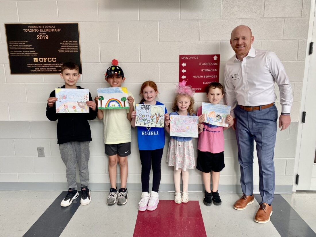 WINNING ARTISTS — J.E. Foster Funeral Home has announced winners of its annual Color Your Spring art contest. With Jay Foster of J.E. Foster Funeral Home are, from left, fourth-grader Remey Hoffman, who was named grand prize winner; third-grader Muhammad Ibrahim; second-grader Kinsley Humphrey; first -grader Skylar Boyd; and kindergartener Maddox Moores. Fifth-grader winner Alexis Blanton also was a top finisher in the contest, which was open to all pupils at Toronto Elementary School. Hoffman’s entry will appear on a billboard along Franklin Street and sponsored by the funeral home. -- Warren Scott