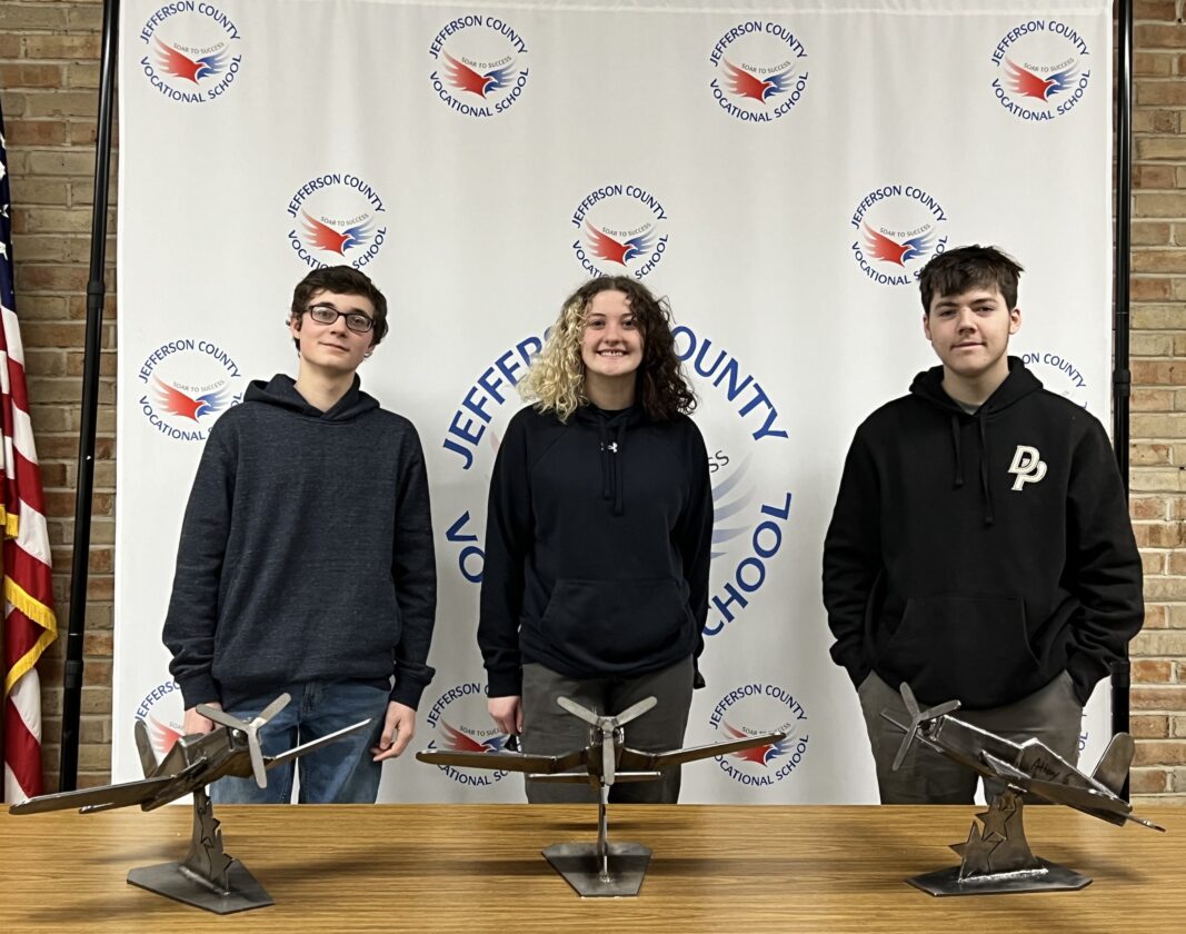 Three welding students at Jefferson County Joint Vocational School have just finished round one of the Project MFG Welding League competition, which assesses their welding knowledge and challenges their skills. Throughout the season, student competitors engage in a series of three project-based challenges that require them to demonstrate proficiency in various welding processes. These projects will evaluate their capabilities in key areas such as fit-up, joint preparation and the quality of the final weld. At the conclusion, the top-performing participants for the year will have the opportunity to compete head-to-head at the Project MFG National Welding Championship for the national title and a $10,000 grand prize. Terry Hanson, Ciara Goff and Anthony Sipes show off their welded steel plane models which were created as part of the contest. (Contributed photo)