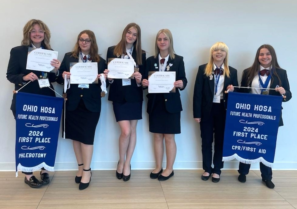 During the state contest, senior Ashley Brown earned first place in phlebotomy; the team of juniors Brooke Scharfenberg and Journey West led the CPR/first aid category; senior Chloe Brooks took third place in physical therapy and patient care technician; the team of junior Daelynn Cordle and senior Madison Cost were third in CPR/first aid; and senior Lexas Lashhorn was fourth place for patient care technician and received a $1,000 HOSA Scholarship. Meanwhile, senior Vanessa Davis attended the University of Toledo’s interactive leadership training.
