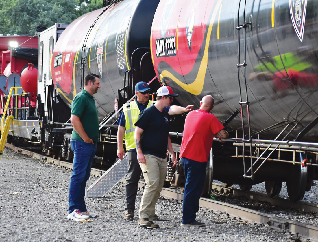Stephanie Elverd TRAINING — The Mahoning County Haz-Mat team participated in Operation Awareness and Response put on by Norfolk Southern on Poland Avenue in Youngstown on June 5. A tank car on the Norfolk Southern’s OAR Safety Train gives first responders a chance to see how thick a typical tanker is. The tanker was one of many cars on the safety train, which gives area first responders on-hand training of derailment events.