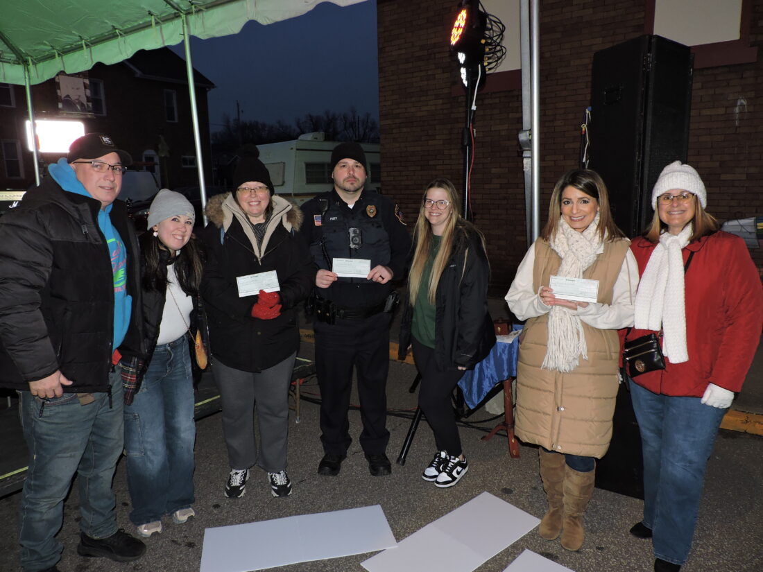 On behalf of several businesses involved in the Gem City Zombie Crawl, Dave Ott and Abby LeMasters presented $1,000 each, from proceeds from the event to three local causes. From left are Ott; LeMasters; Amy Rice of Toys for Toronto, a toy drive held by Crossroads North River Church; Toronto Police Capt. Derek Piatt and his wife, Jessica, who are among organizers of Christmas with a Cop; and Amanda Yazbek and Maureen Taggart, board members for the Helping Hands Food Pantry, of which Rice also is director. Participating in the Oct. 25 event were the White Front Cafe, Squid’s Brewery, Rusty Bull Taco Co., Toronto American Legion, Toronto Eagles Lodge, Frog’s Place, Toronto Lanes, Tri-B’s Coffee Shop and the Last Resort Riverfront Bar & Grill.