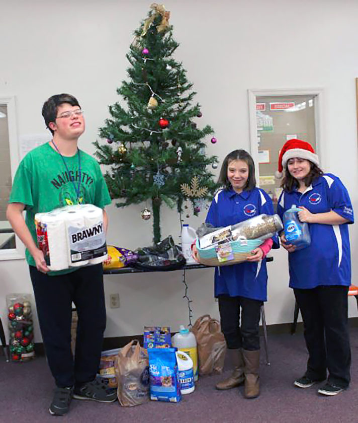GIVING ‘PAWS’ FOR A CAUSE — Transition to Work students at the Jefferson County Joint Vocational School who helped collect needed items to benefit the local St. Gertrude Cat Initiative were Elijah Fox, Angela Talbott and Hope Reed. -- Contributed