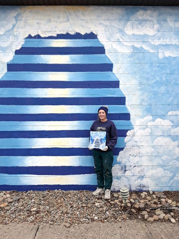 The mural depicts a sunlit stairway to heaven among clouds in a blue sky. It complements the Rock Garden of Remembrance, which was created by the parish’s GriefShare group.