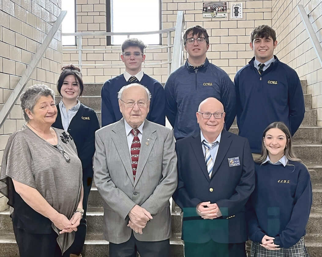 Knights of Columbus Monsignor Joseph F. Dooley Council No. 4361, Mingo Junction, recently awarded five $200 scholarships to outstanding students attending Catholic Central High School, Steubenville. On hand for the presentation were, front, from left, Jude Lucas, principal of Catholic Central High School; Baci Carpico, past state deputy of the Ohio Knights of Columbus and current trustee of the Knights of Columbus Monsignor Joseph F. Dooley Council No. 4361, Shawn Zarych, Grand Knight; and Marcella Balzano; and back, Gina Crust; Dominic Libetti; Brendan Grimm; and Andrew Dorsey. Carpico said that this marks the ninth consecutive year that the Knights have provided tuition money to Catholic Central students.