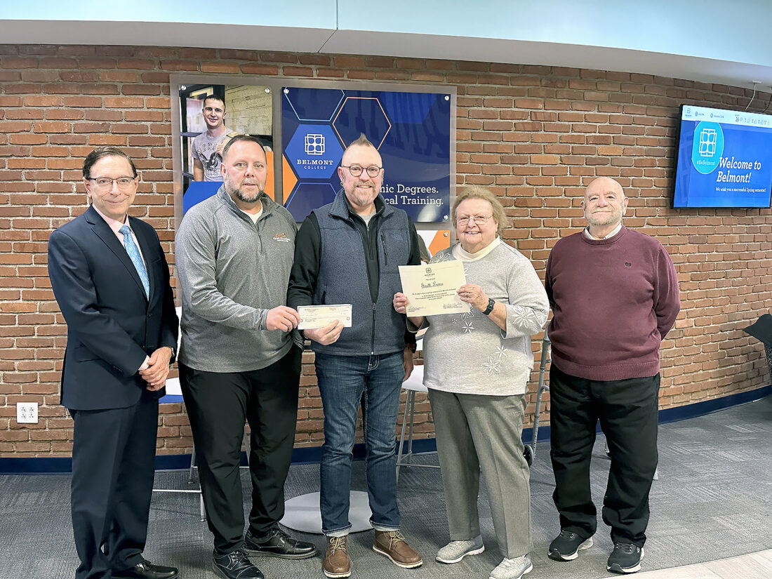 ADENA STUDENT RECEIVES SCHOLARSHIP — Belmont College’s Scott Larue, a second-year cyber security and computer forensics major from Adena, received a $500 Elizabeth Gates Technology Scholarship to assist with his educational tuition. Provided by Omni Strategic Technologies, this was the first time Belmont College has had a student receive this scholarship. Gates, a board of trustees member and trustee chairwoman, is a consultant with Omni Strategic Technologies. Those at the presentation ceremony included, from left, Belmont College President Paul Gasparro, Omni Strategic Technologies President Chip Calissie, Larue, Gates and Henry Cardello, associate professor at the college. -- Contributed