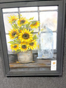 OCTOBER ARTISTS FEATURED AT VISITOR CENTER — Nancy Wright, left, along with her sister, Joyce Beatty, were named the Steubenville Art Association’s artists of the month for October. Wright, who stands alongside her hummingbird artwork, shares the autumn spotlight with her sister, who created works incuding the sunflowers in the vase and the village scene where laundry is being hung. Their works can be seen at Historic Fort Steuben’s Visitor Center. -- Contributed