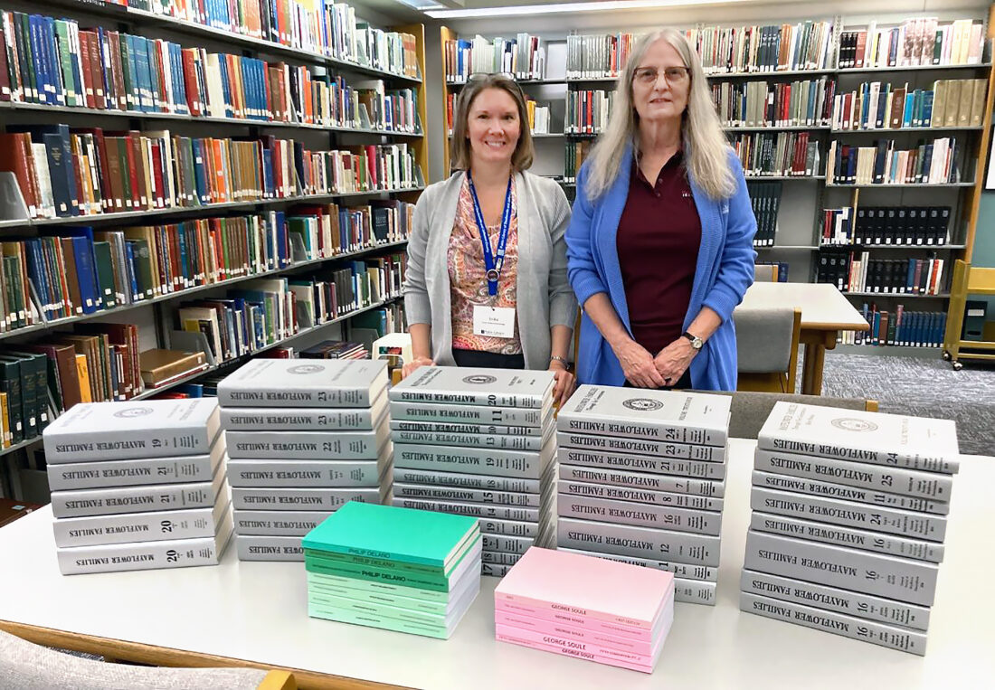 The Public Library of Steubenville and Jefferson County announced the Local History and Genealogy Department at the Schiappa Library has received a donation of 53 books from Ohio’s Society of Mayflower Descendants. The donation includes 38 books in publication from the Silver Books series “Mayflower Families through Five Generations,” with a three-volume index. The project began in 1959 to trace the first five generations of descendants from each Mayflower passenger who left behind descendants. According to library officials, it is a valuable addition to the local history department, as it allows researchers to locate possible ancestral links to the Mayflower pilgrims. On hand for the book presentation were Erika Grubbs, Local History and Genealogy Department, left, and Terri Brown, deputy historian of Ohio’s Society of Mayflower Descendants.