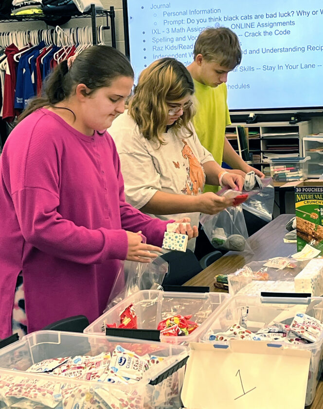 Transition to Work students at the Jefferson County Vocational School performed community service with “Socktober.” Instructor Jennifer Davis said students collected and filled 55 baggies full of socks, personal care items and snacks, adding positive notes to be donated to the Friendship Room in Steubenville and the WEBA Food Pantry in Amsterdam. Davis said more service projects are planned. Preparing some of the bags were, from left, junior Addyson Myers and seniors Katie Anderson and Tim Miller.