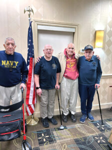 CLUB HONORS ITS VETERANS — Members of the International Senior Club honored veterans of the United States military during the group’s monthly meeting, held Nov. 11, Veterans Day. Those who were thanked for their sacrifice and service to this nation were, from left, Dino Rossi, Navy veteran; Terry Ramsey, Navy veteran; Gabe Arlia, Marine veteran; and James Cerra, Navy veteran. -- Contributed