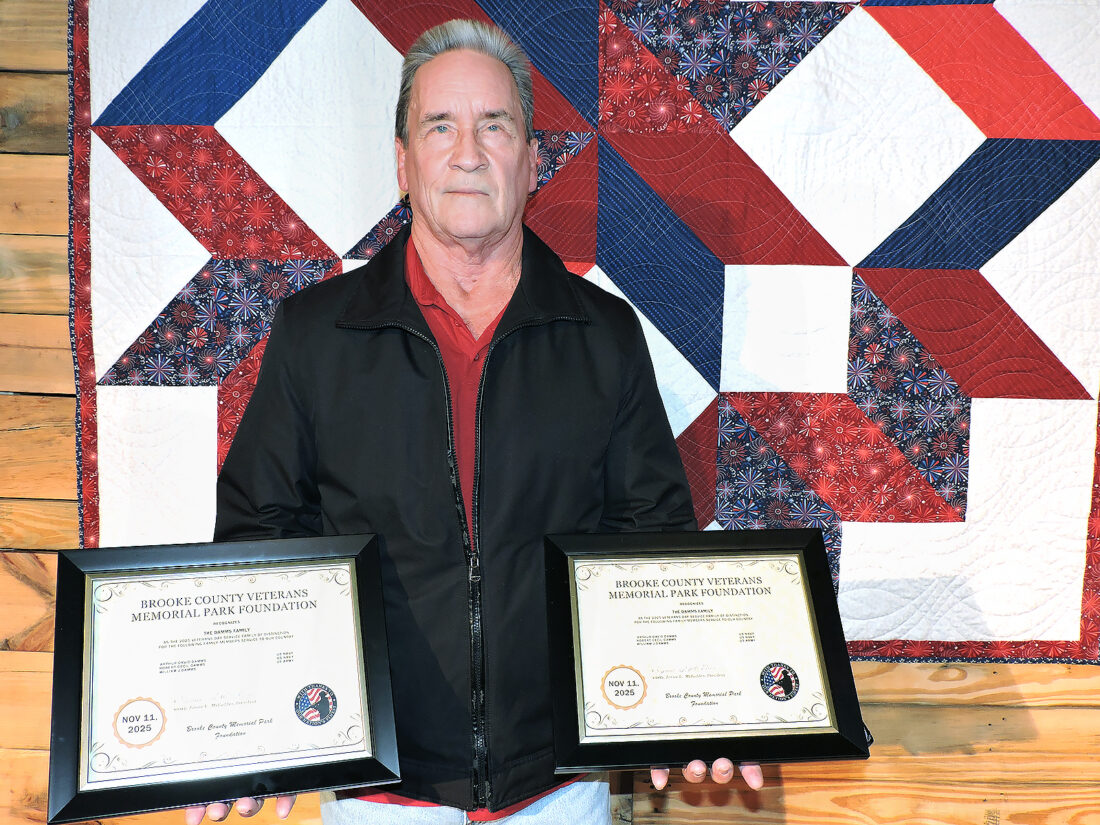 - HONORING FAMILIES — Marty Damms of Weirton, accepted plaques honoring his late father, Arthur, and his late uncles, Robert and William Damms, for their service during World War II. The quilt in the background is one of two sewn by Christine Andreozzi Brewer. — Warren Scott