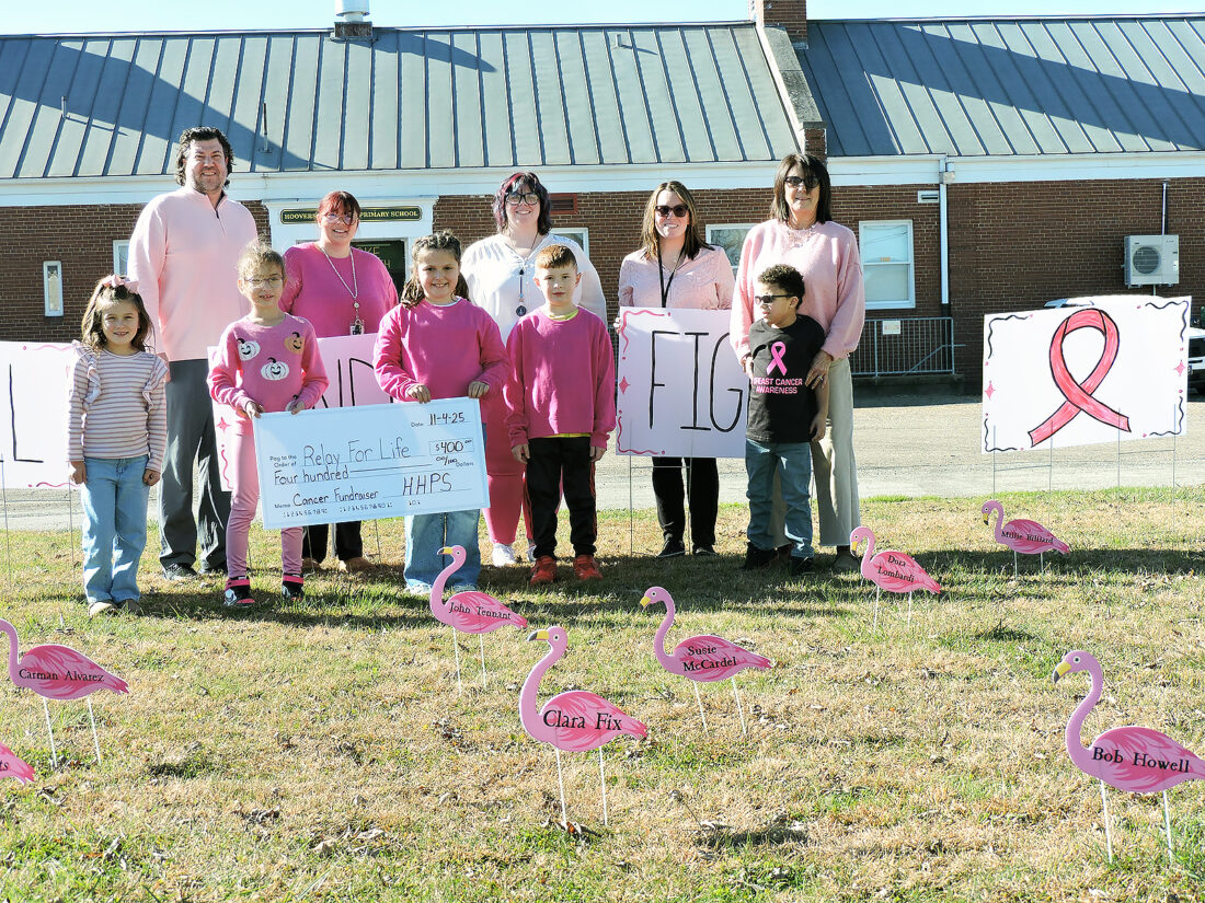 LENDING A HAND — Children and staff at Hooverson Heights Primary School stood flamingos bearing the names of local residents who have battled cancer as a fundraiser for the American Cancer Society, generating $400. Those taking part included, from left, front, Gia Lyle, Margo Baldauf, Jojo DiMarzio, Cayson Huff and David Simakis; and back, teacher and co-ordinator Matt Vein, Kyrsten Myers, Delaynie Campinelli, Arah DeMaria and Ann Bendle. -- Warren Scott