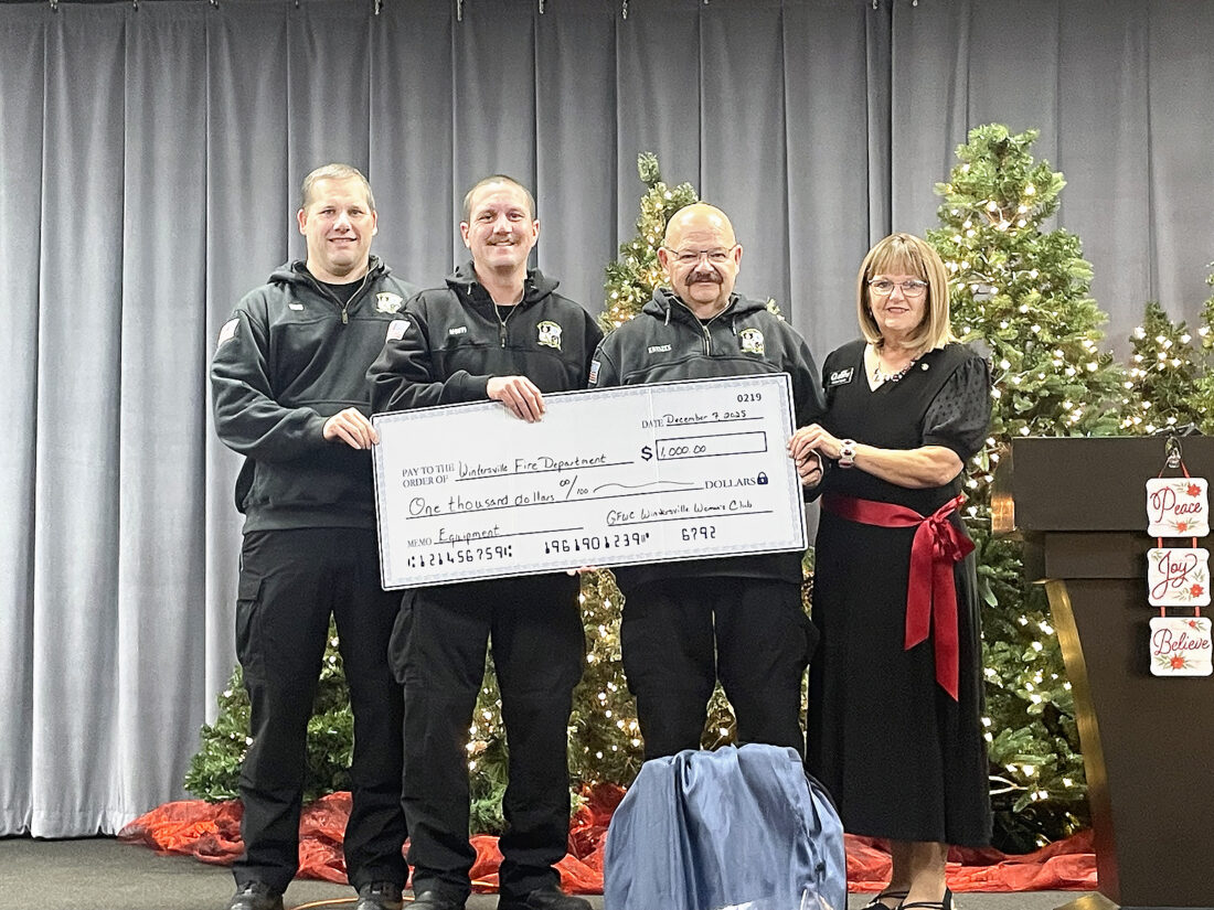 Members of the Wintersville Woman’s Club presented those with Wintersville Fire and Rescue a monetary donation of $1,000. The gift was given to help assist the emergency services department with expenses. In addition to the check, the club gave two large trays of cookies to the department’s staff and volunteers in the past few weeks to express its appreciation for all firefighters do for their community and surrounding communities throughout the year. Those who were on hand for the check presentation included, from left, Lt. Anthony Kniszek, Lt. Aaron Mosti, firefighter Brian Moss and Wintersville Woman’s Club President Cheryl Taylor.