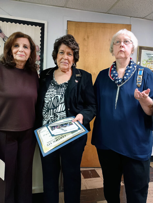 Secretary Vickie Joseph conducted a good citizen recognition presentation, after which lunch was served, followed by a program. Rymer gave a pictoral report of previous meetings, highlighting members’ accomplishments and presentations. She presented certificates of appreciation to chapter members Jeanne Vega and Francine Hauldren for their hard work and dedication arranging the planting of the patriot tree. Vega initiated the project, which was brought to completion by Hauldren.
