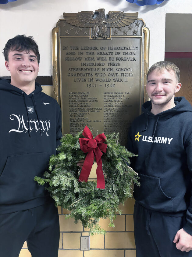 Seniors at Steubenville High School recognized alumni who served in World War II by placing a wreath on a plaque in the building. The wreath was given as part of the Wreaths Across America event, a tradition that remembers and pays tribute to veterans. The long-standing tradition was begun by the Class of 1950, who raised funds to purchase a plaque commemorating classmates who gave their lives in service. Students enlisting in the service who honored past veterans included,