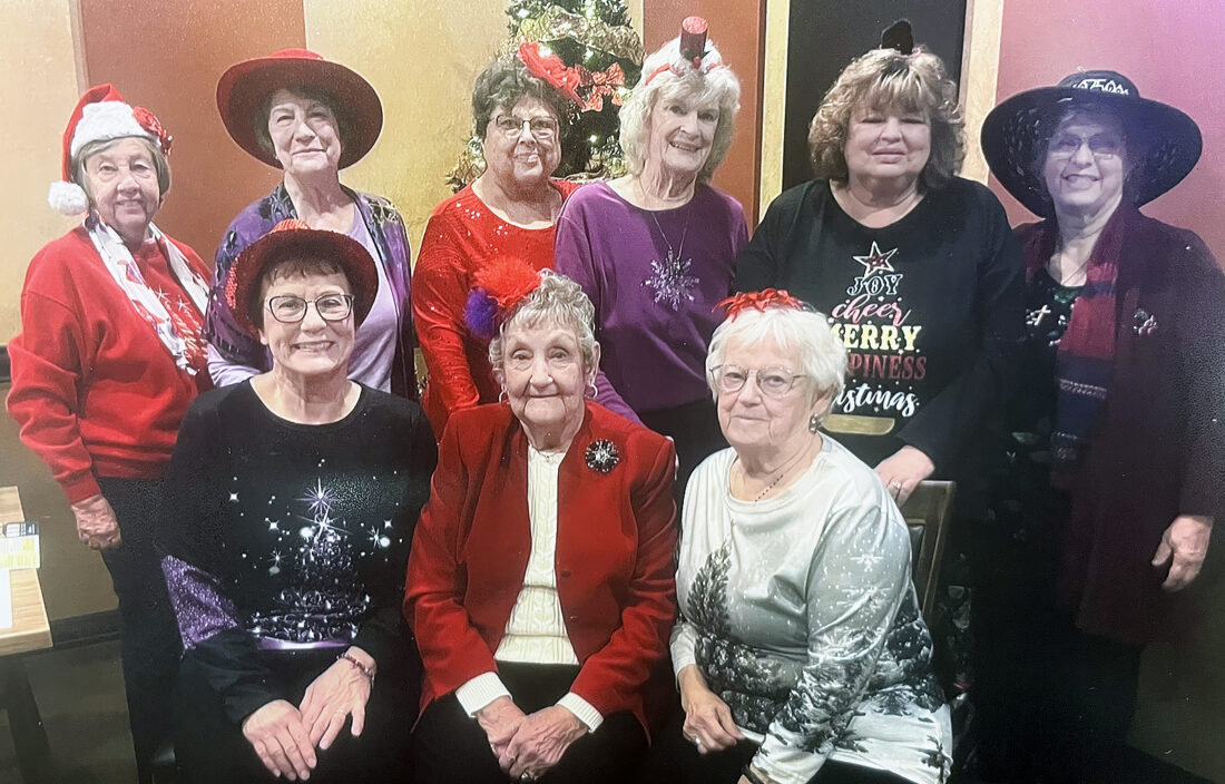 The Weirton Red Hat Sassie Lassies met at Theo Yanni’s in Weirton. Those in attendance were, from left, front, Barb Coburn, Connie Gilbert and Linda Walter; and back, Connie Norwood, Queen Ruth Dalesandri, Margie LeMasters, Martha Varitek, Brenda Edwards and Carla Colson.