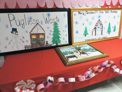 Students and staff at the four elementary schools in the Steubenville City School District created winter scenes, which were then reproduced by Nelson Fine Art and Gifts to appear as billboard banners. The idea was suggested by Patrick McLaughlin, a custodian for the school district and an employee of Nelson’s. Winter scenes were the focus of the billboards. Above, works were created by those at Pugliese West Elementary and Wells Academy. At bottom, a cup of hot cocoa and gingerbread village were the subjects of those at McKinley STEM Academy and Pugliese East Elementary.