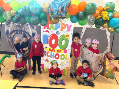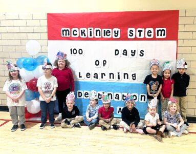 Students in the Steubenville City School District celebrated 100 days of school Jan. 28. A variety of activities highlighted the occasion. Those at East Garfield Elementary School, above, did a dinosaur-themed “100 Days of Discovery: Digging, Discovering and Learning Together.” Children included, from left, front, Kylonnie Robertson, LaWan Livingston III and Myles Thomas; and back, Tilal Johnson, Lilala Miller, Sebastian Janik, Elliana King, Heavenly Zylko and Niklaus Miller. Below, McKinley STEM Academy touted “100 Days of Learning — Destination USA” as its theme. Preschoolers celebrating included, from left, front, Luca Scurti, Enzo DiCarlantonio, Lai’Lyn Johnson, D’ari Fleshman, Piper Cottrill and Penelope Poludniak; and back, Emry Virtue, Sigi Cutri, Cicely King, Isabella Torres, Avionna Jeter and Adonis Wilson.