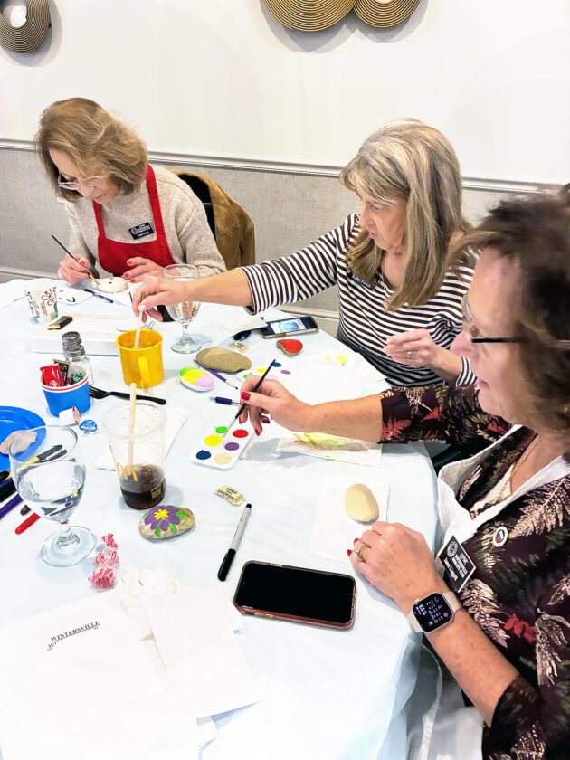 Prior to the noon luncheon, Amy Jaros led the group in meditation and grace, setting a peaceful tone for the productive day ahead. The highlight of the afternoon was a creative activity that took the women away from the gray winter skies and into a world full of color. Led by Connie Cimaglia, chairman of the arts and culture committee’s community service project, those in attendance traded their pens for paintbrushes and participated in a “positivity rocks” project.