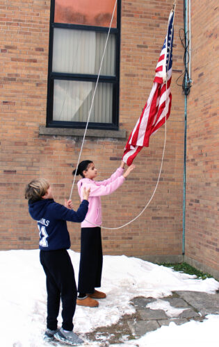 Fourth-graders Teagan Clark, left, and Legacy Wright, raised the American flag as part of the school’s morning routine at Buckeye North Elementary School. Students are trained to perform the task by Deb Gilchrist, chaplain of the Brilliant American Legion Post 573. Volunteers are selected to ...
