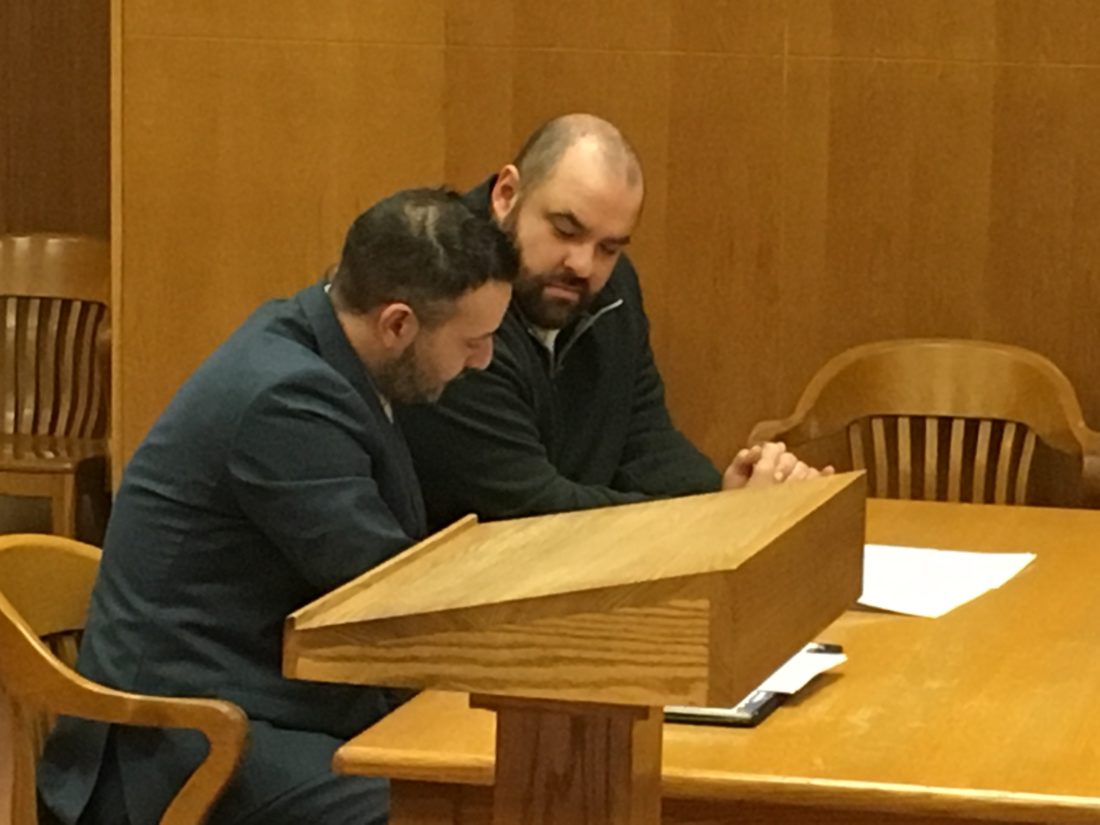 PLEADING GUILTY — Former Steubenville Police officer Nate Cline, right, and his attorney, Ryan Shafer, answer questions from Jefferson County Common Pleas Judge Michelle Miller during a plea change hearing for Cline on Tuesday. Cline pleaded guilty to felony and misdemeanor charges, mainly in association with illegal hunting. -- Mark Law