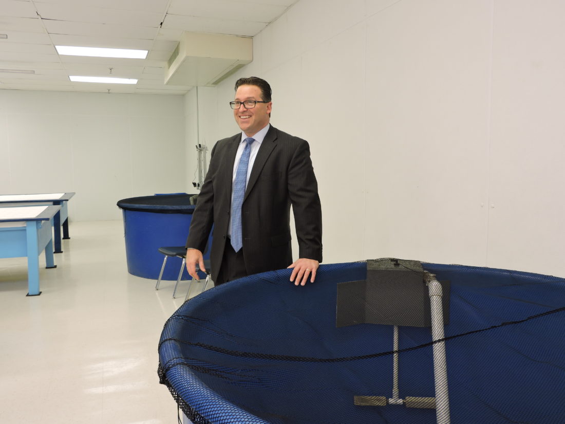 - Dan Spickard, president of Blue Stream Farms, stands with one of the tanks set to be used to raise tilapia as part of the organization’s aquaponics operations in Weirton. Teaming up with area high schools, the program is aimed toward establishing new educational programs and business opportunities in the region. — Craig Howell
