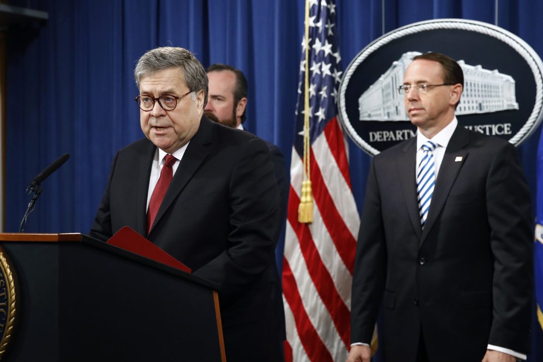 RELEASE — Attorney General William Barr speaks alongside Deputy Attorney General Rod Rosenstein, right, and acting Principal Associate Deputy Attorney General Edward O'Callaghan about the release of a redacted version of special counsel Robert Mueller's report during today's news conference at the Department of Justice in Washington. -- Associated Press