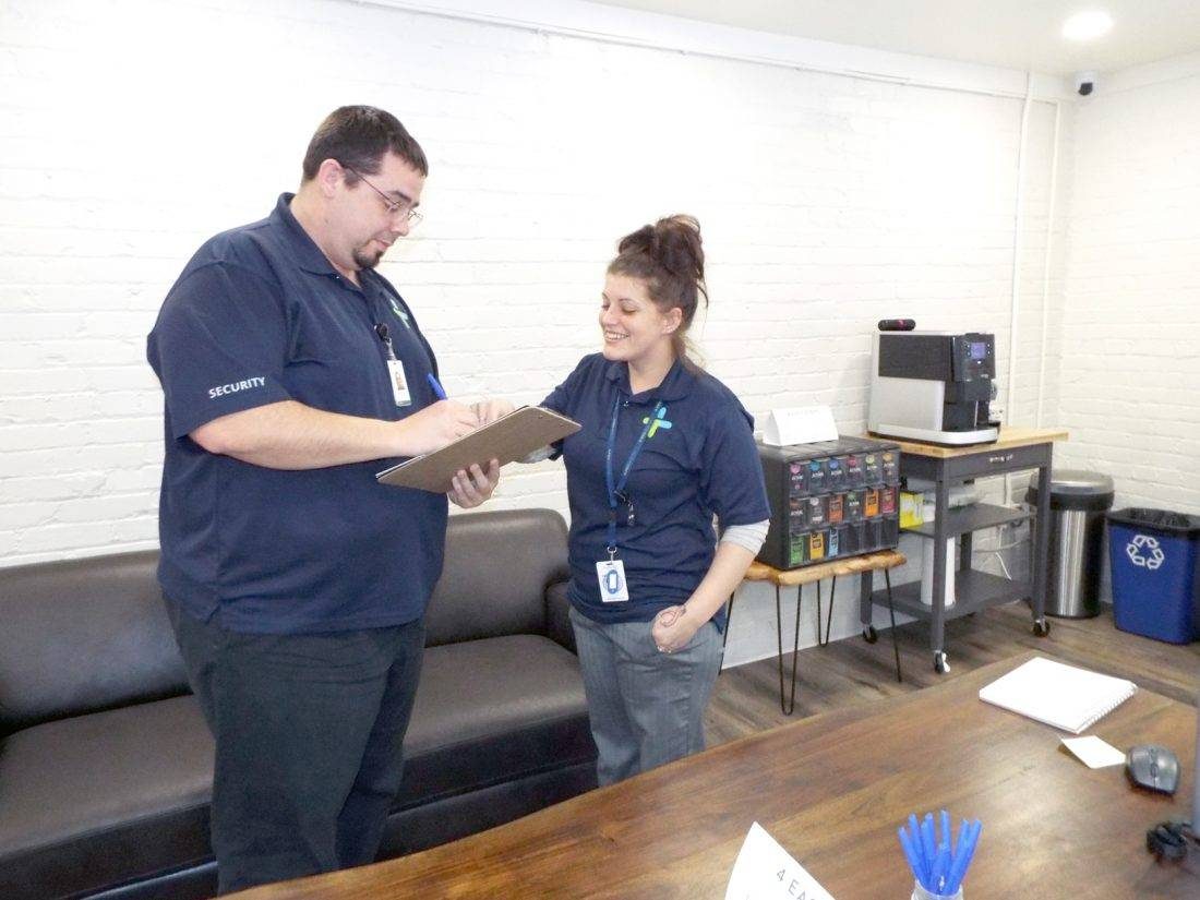 DISCUSSING OPERATION — Jason Shipley and Michelle Caldwell, brand ambassadors for FRX Health, greet visitors in the dispensary’s front waiting room before patients make their way back to the vault to speak with a pharmacy regarding recommended medical marijuana options. -- Stephanie Ujhelyi