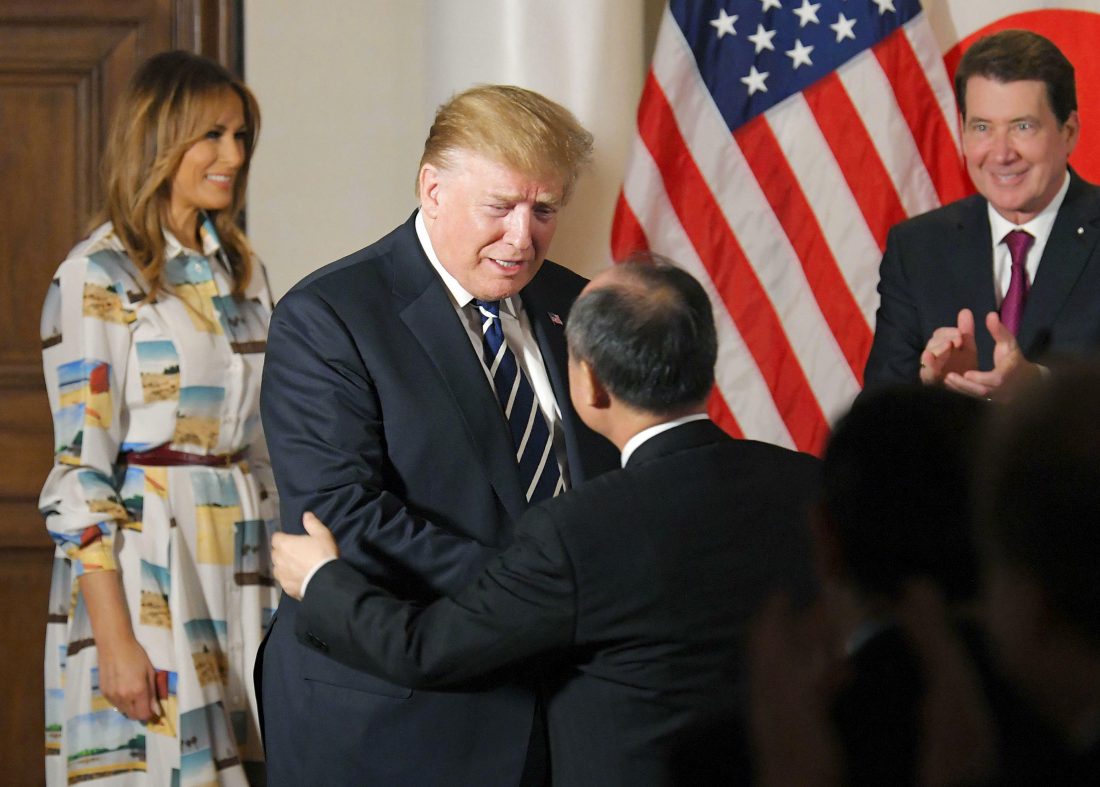 U.S. President Donald Trump, center left, greets SoftBank Group Corp.'s Chief Executive Masayoshi Son, center right, as first lady Melania Trump, left, and U.S. Ambassador to Japan William Hagerty look on during his meeting with business leaders, in Tokyo, Saturday. President Trump is on a four-day state visit in Japan. -- Associated Press