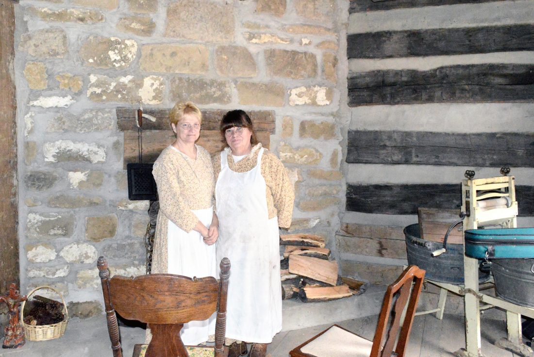 A TRIP BACK IN TIME — Sisters Robin Jenkins, left, and Debra Kimball spent the weekend living as pioneers at the 1788 Wells Log House in Wellsburg. -- Amy Neeley