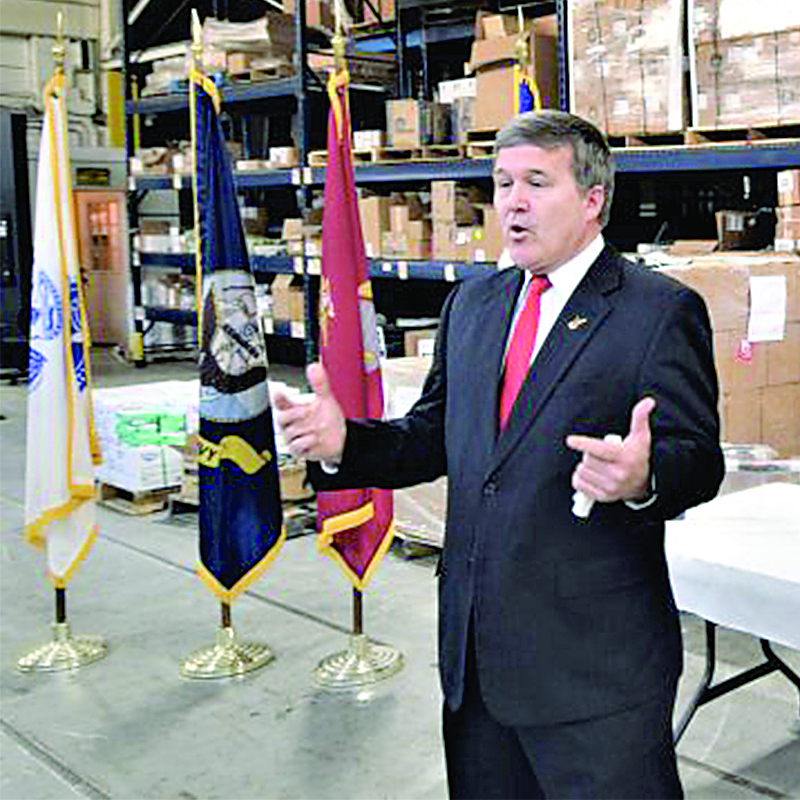 TAKING PRECAUTIONS — West Virginia Secretary of State Mac Warner speaks during a press conference at Liberty Distributors Inc. in Triadelphia Wednesday morning about the personal protection equipment and cleaning supplies being delivered to all 55 counties. -- Scott McCloskey