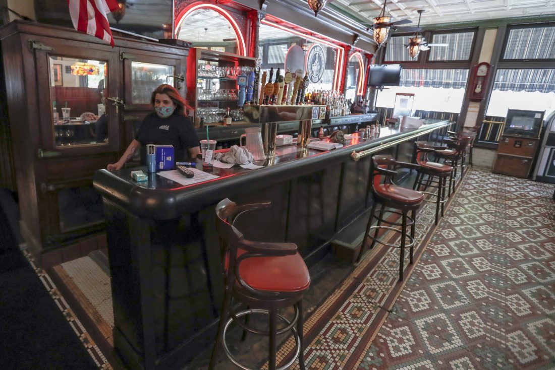 Bartender Sara Kennely, walks behind the bar as preparations, like spacing out the barstools, are underway, Thursday, June 4, 2020, at Max's Allegheny Tavern on Pittsburgh's North Side for patrons to dine inside is permitted when most of southwest Pennsylvania loosens COVID-19 restrictions allowing eat-in dining on Friday. (AP Photo/Keith Srakocic)