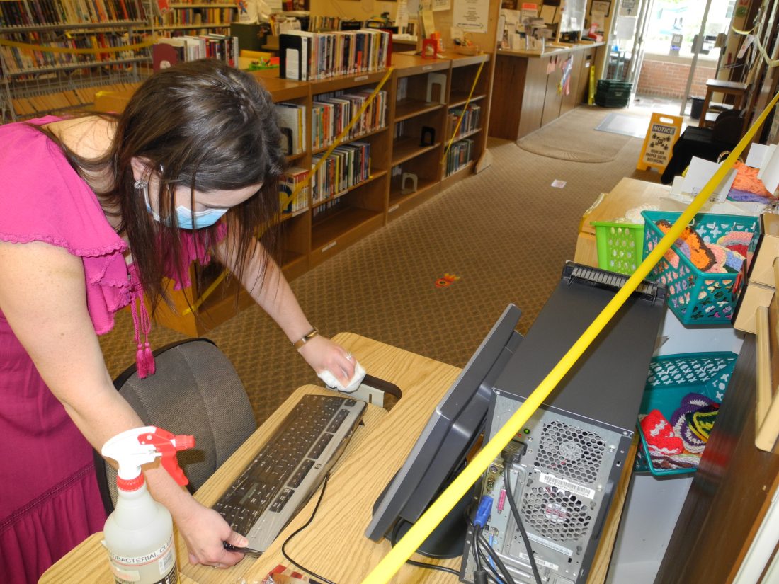 A GRADUAL REOPENING. Alex Schneider, director of the Brooke County Public Library, wipes down the keyboard of a computer with which patrons may search for books and other materials there. Shelves of books there and at its Follansbee branch have been temporarily taped off to prevent spread of COVID-19, so the library's staff is prepared to collect any books or other items desired by patients who use the computer or order them online at home. -- Warren Scott