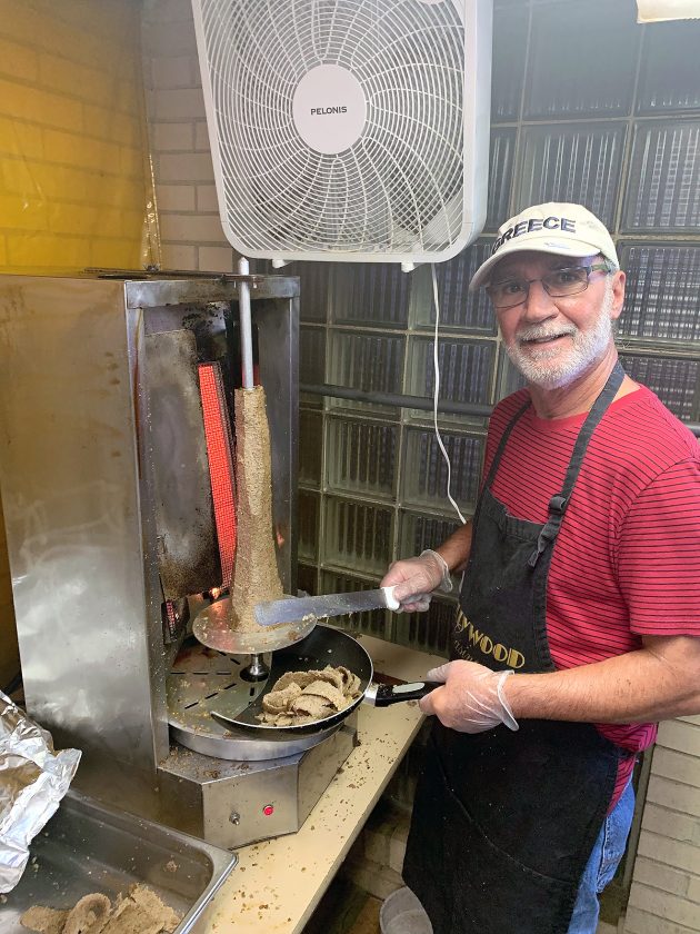 ALWAYS A FAVORITE — Gyros are always a favorite when All Saints Greek Orthodox Church at 3528 West St., Weirton, holds its annual Greek Food Festival. This year’s offering, however, because of COVID-19 precautionary measures, brings changes to the summer staple normally held during a three-day period in July. Instead, there will be a super gyro sale from 11 a.m. to 2 p.m. on Aug. 27 at the church’s newly built food booth behind the downtown post office facing the church. The gyros may be pre-ordered by phone at (304) 797-9884 beginning Aug. 25 through 11 a.m. on Aug. 27, online at www.allstswwv.org or the day of in person. The church also is planning a one-day, take-out-only Greek Grab ‘n Go Fest on Sept. 25 that will feature a variety of Greek food and sweets. This contributed photo from the 2019 festival shows volunteer Naso Chaliotis helping with the gyros.