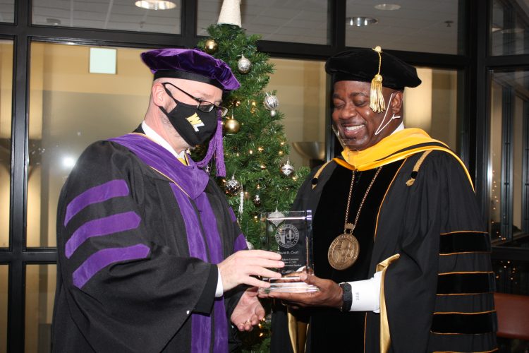 COMMENCEMENT — David Croft, president of the Ohio County Board of Education and keynote speaker Saturday at the West Liberty University fall commencement, accepts a commemorative award from university President W. Franklin Evans. -- Contributed