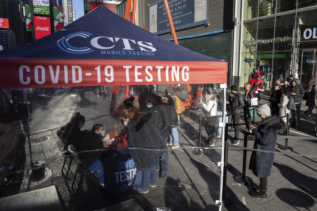 FILE - People wait in line at COVID-19 testing site in Times Square on Dec. 3, 2021, in New York. The fast-moving omicron variant may cause less severe disease on average, but COVID-19 deaths in the U.S. are climbing and modelers forecast 50,000 to 300,000 more Americans could die by the time the wave subsides in mid-March. (AP Photo/Yuki Iwamura, File)