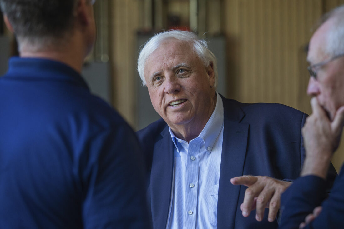 FILE - Gov. Jim Justice, center, speaks to Merl Wooten, owner of Wooten Machine Co., left, and Dr. Matthew Rohrbach while visiting community members on May 9, 2022, in Huntington, W.Va. Justice said Wednesday, Jan. 4, 2023, that he will announce a plan to cut taxes during his State of the State address on Jan. 11. (Ryan Fischer/The Herald-Dispatch via AP, File)