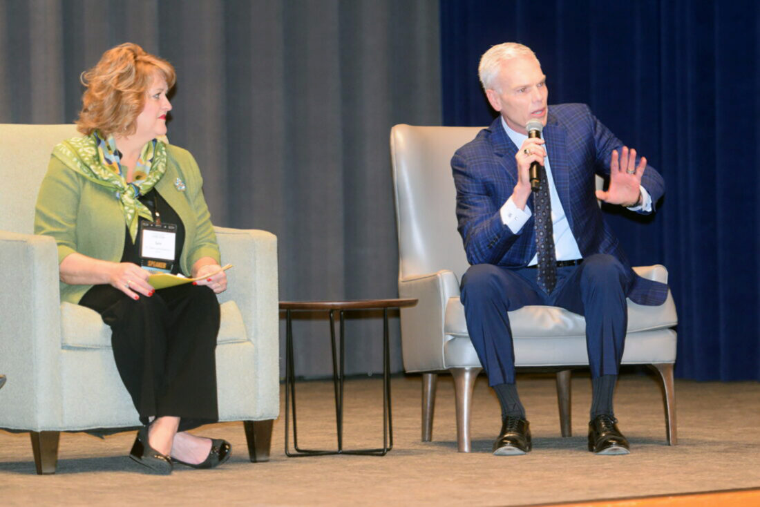 BUILDING A BRIDGE — Marshall University President Brad Smith talks to the audience Tuesday during a roundtable discussion at Bridging Innovation at Oglebay’s Wilson Lodge. With him on the panel is Sara Stankus, Deputy State Superintendent of Schools in West Viriginia. - Derek Redd