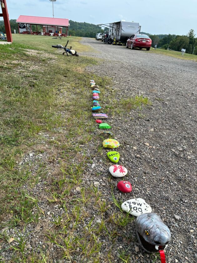 A WORK IN PROGRESS — Visitors to Brooke Hills Park are invited to add a painted stone to Brookes the Snake, a serpentine creation winding its way from Brooke Hills Playhouse to the Brooke County fairgrounds, post a photo of themselves with it to the fair’s Facebook page and be entered into a drawing for free admission to the event, which will be held Friday through Sept. 17. A rodeo, demolition derby, rides and inflatable attractions for children are among the many events and activities offered this year. -- Contributed