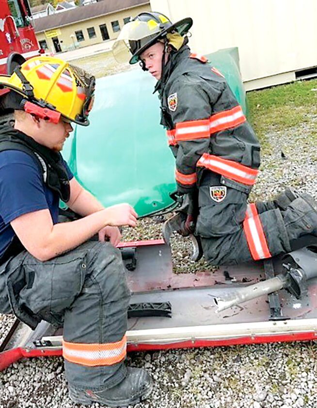 PICKING UP SKILLS — Newell Volunteer Fire Department’s junior firefighter C.J. Duty works during a demonstration with senior firefighter Connor Lang as they learn about vehicle accident entrapments and how small staffs can benefit from multipurpose TNT tools. For example, the TNT provides firefighters with five tools in one: axe, ram, pry, sledge and pike pole. The National Fire Protection Association has found that one-third of volunteer firefighters are older than age 50; however, the Newell VFD’s Junior Firefighter program has served as a recruitment tool. -- Contributed