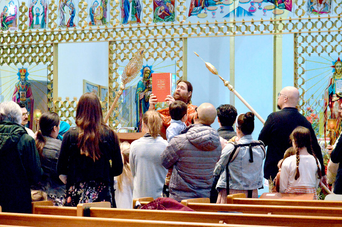 GOSPEL — The Rev. Peter Wingerter, pastor of the Steubenville Melkite Catholic Community, finished proclaiming the gospel reading during divine liturgy. Members of the community approached Wingerter and stood around him during the proclamation, as is customary in some Melkite churches. -- Christopher Dacanay