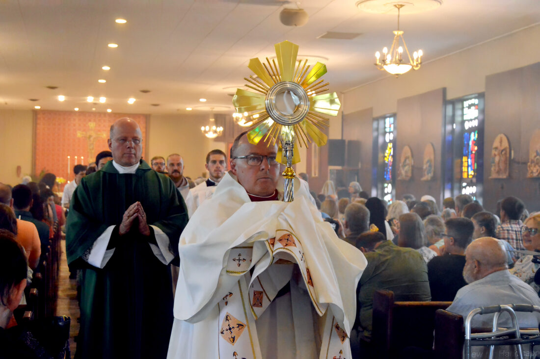 - EUCHARIST — Bishop Edward Lohse, apostolic administrator of the Catholic Diocese of Steubenville, held the Eucharist and processed down the center aisle of Holy Rosary Church, following the Mass Sunday. — Christopher Dacanay