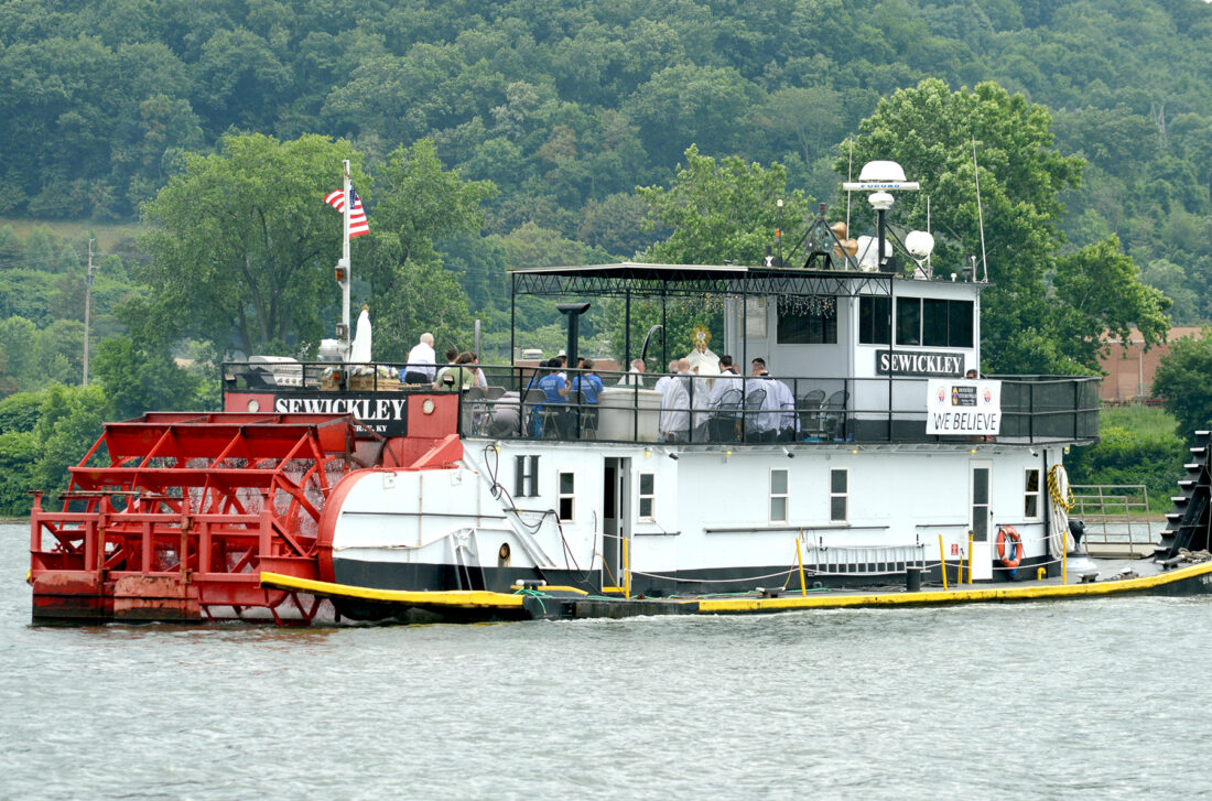 Lohse and others boarded a sternwheeler, which traveled down the Ohio River to Wheeling. Along the way, the boat’s bell rang, signaling Lohse and the Eucharist to bless the community on the Ohio side, while Bishop Mark Brennan of the Diocese of Wheeling-Charleston blessed those on the West Virginia side. Blessing locations included the Steubenville Marina, Wellsburg Wharf, Wellsburg-Brilliant Bridge, Mazeroski Park, Pike Island Locks and Dam and Heritage Port.