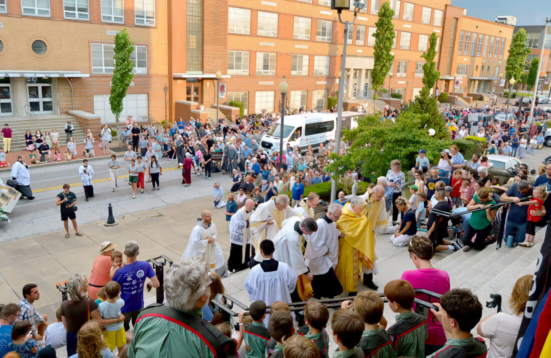 PROCESSION — Participants in Friday’s Eucharistic procession from Adams Street to St. Peter Catholic Church in Steubenville gather by the church as Bishop Paul Bradley, former apostolic administrator of the Catholic Diocese of Steubenville, carried the Eucharist up the steps and inside. -- Christopher Dacanay