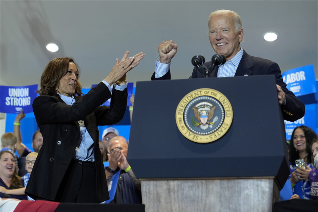 President Joe Biden and Democratic presidential nominee Vice President Kamala Harris campaign at the IBEW Local Union #5 union hall in Pittsburgh on Labor Day, Monday, Sept. 2, 2024. (AP Photo/Susan Walsh)