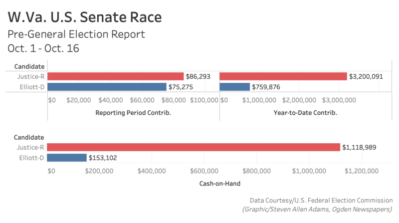 In the Senate race, fundraising remained competitive for the third reporting period in a row between Republican Gov. Jim Justice and former Democratic Wheeling mayor Glenn Elliott, though Justice has 150 percent more cash-on-hand in the final days of the race.