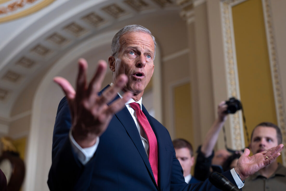 Senate Majority Leader John Thune, R-S.D., gestures while speaking with reporters as the government lurches toward a shutdown at the Capitol in Washington, Tuesday, Sept. 30, 2025. (AP Photo/J. Scott Applewhite)